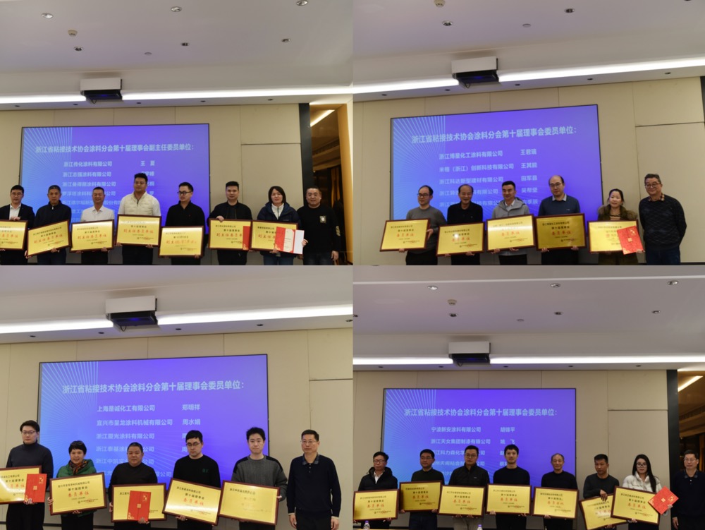 接着由浙江省粘接技术协会理事长张兴宏、秘书长王益民、涂料分会名誉主任赵新建、秘书长安靖共同为分会第十届理事会委员单位颁发铜牌及个人委员颁发证书,进一步凝聚理事会成员向心力。