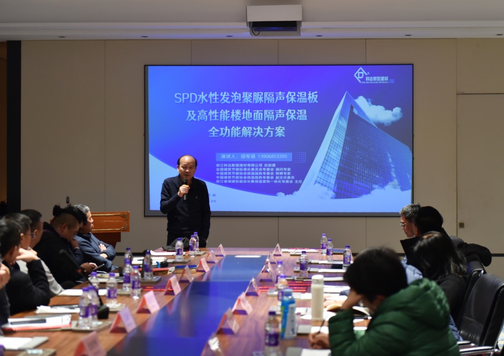 紧接着,浙江科达新型建材有限公司总经理田军县带来题为《SPD水性发泡聚脲隔声保温板及高性能楼地面隔声保温全功能解决方案》的专题分享,为与会代表展示了新型建材在绿色建筑中的创新应用。田总表示,该项目是根据住建委造“好房子”的要求开发研制的,应用前景广阔,欢迎有意向合作的同仁们前来咨询交流洽谈。